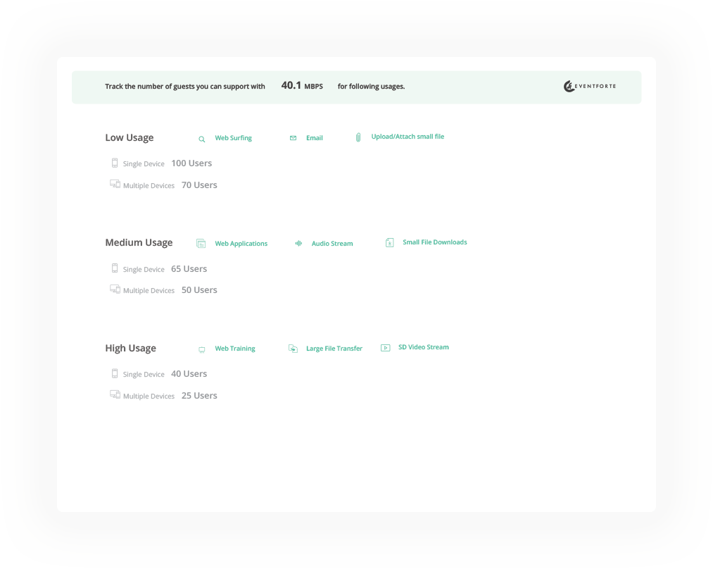 Not sure how many attendees your venue's wifi will support? Don't guess - using our free tool, you'll get an approximate idea of how many attendees can be supported on your venue's wifi along with metrics based on low, medium, and high usage.